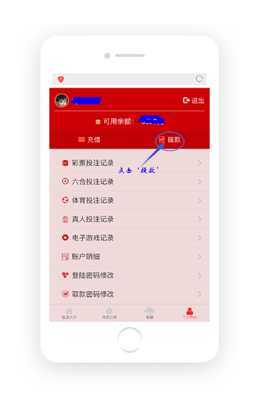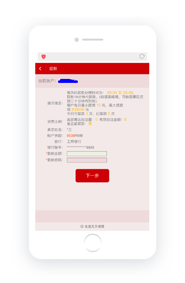 输入您的取款金额及网站取款密码,点击“下一步”,即可提款。